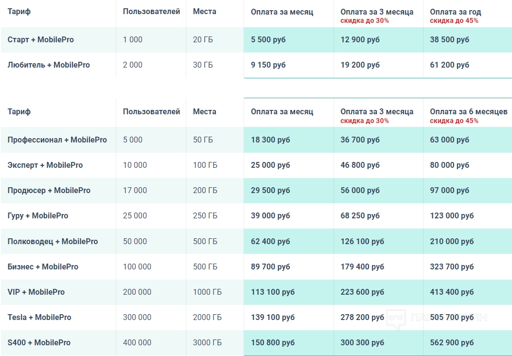 Если клиент рассматривает тарифы для базы более 400 000 пользователей, нужно обратиться в техническую поддержку для уточнения стоимости.