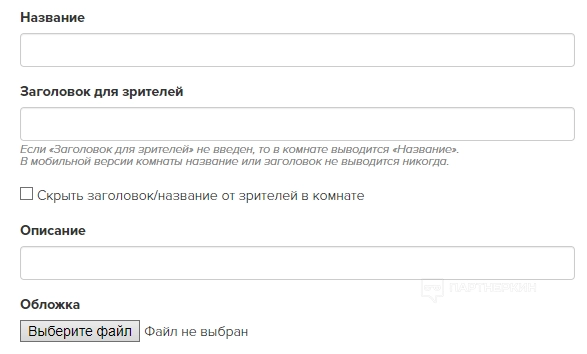 Заголовок для зрителей . Если это поле останется пустым, то в вебинарной комнате выводится «Название». При необходимости есть возможность скрыть заголовок и название от зрителей.