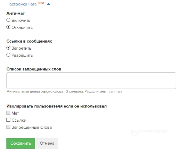 Чат . Настройка параметров «Анти-мат», «Ссылки в сообщениях». Еще здесь можно указать список запрещенных слов. Если зритель нарушит правила, можно исключить его из эфира.