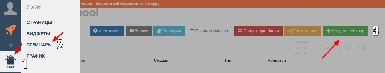 Для запуска прямой трансляции нужно перейти в раздел «Сайт», выбрать пункт «Вебинары» и нажать на заголовок стрима.