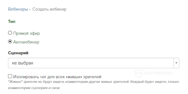 Тип . Прямой эфир или автовебинар. При выборе второго варианта нужно задать сценарий, который автоматически формируется после проведения «живого» вебинара на