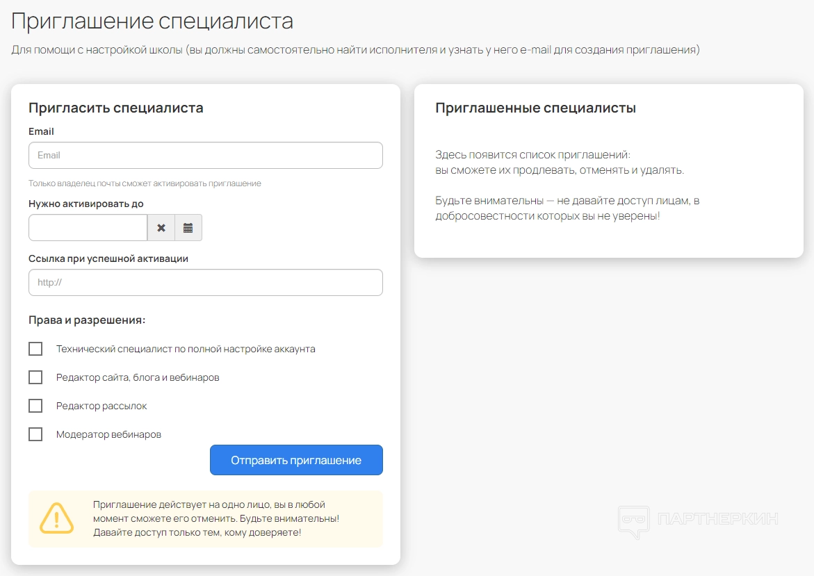 Здесь представлены пользователи из разных групп (активные участники, приглашенные, ученики, отписавшиеся юзеры), сотрудники, сегменты и достижения. Организатор мероприятия может также пригласить специалиста. Для этого нужно заполнить следующую форму и нажать «Отправить приглашение».