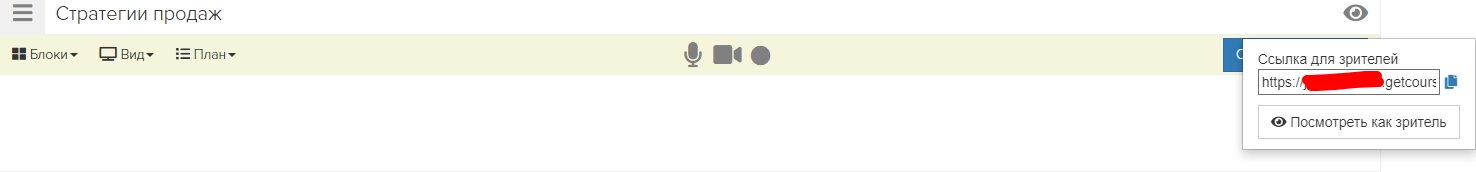 - Для приглашения зрителей необходимо выбрать значок глаза в правом верхнем углу. При нажатии на кнопку появится ссылка, которую нужно отправить пользователям.