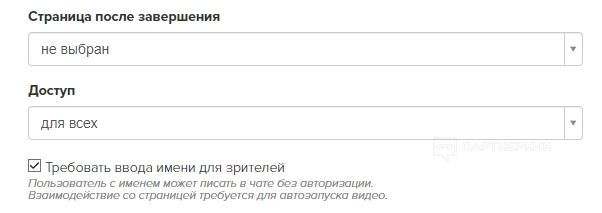 Доступ . Настройка прямой трансляции для трех категорий: все, авторизованные, группы. Можно поставить галочку в пункте «Требовать ввода имени для зрителей».