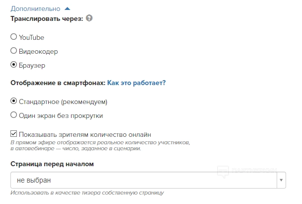 Дополнительные настройки. Проведение трансляции возможно с помощью трех способов: