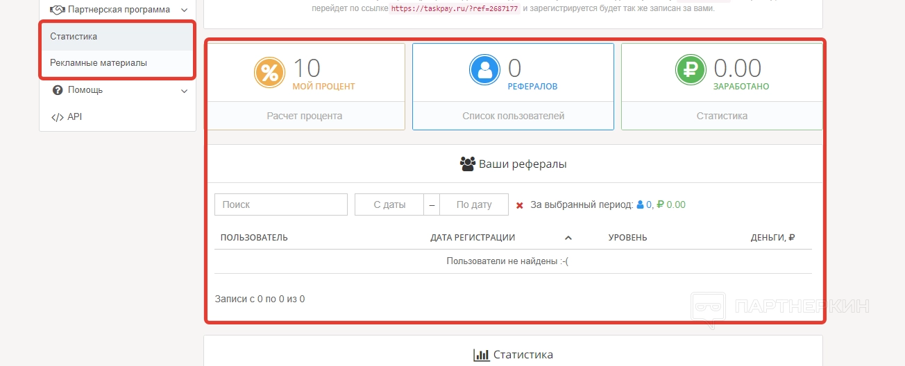 - статистика — сведения по работе с рефералами;