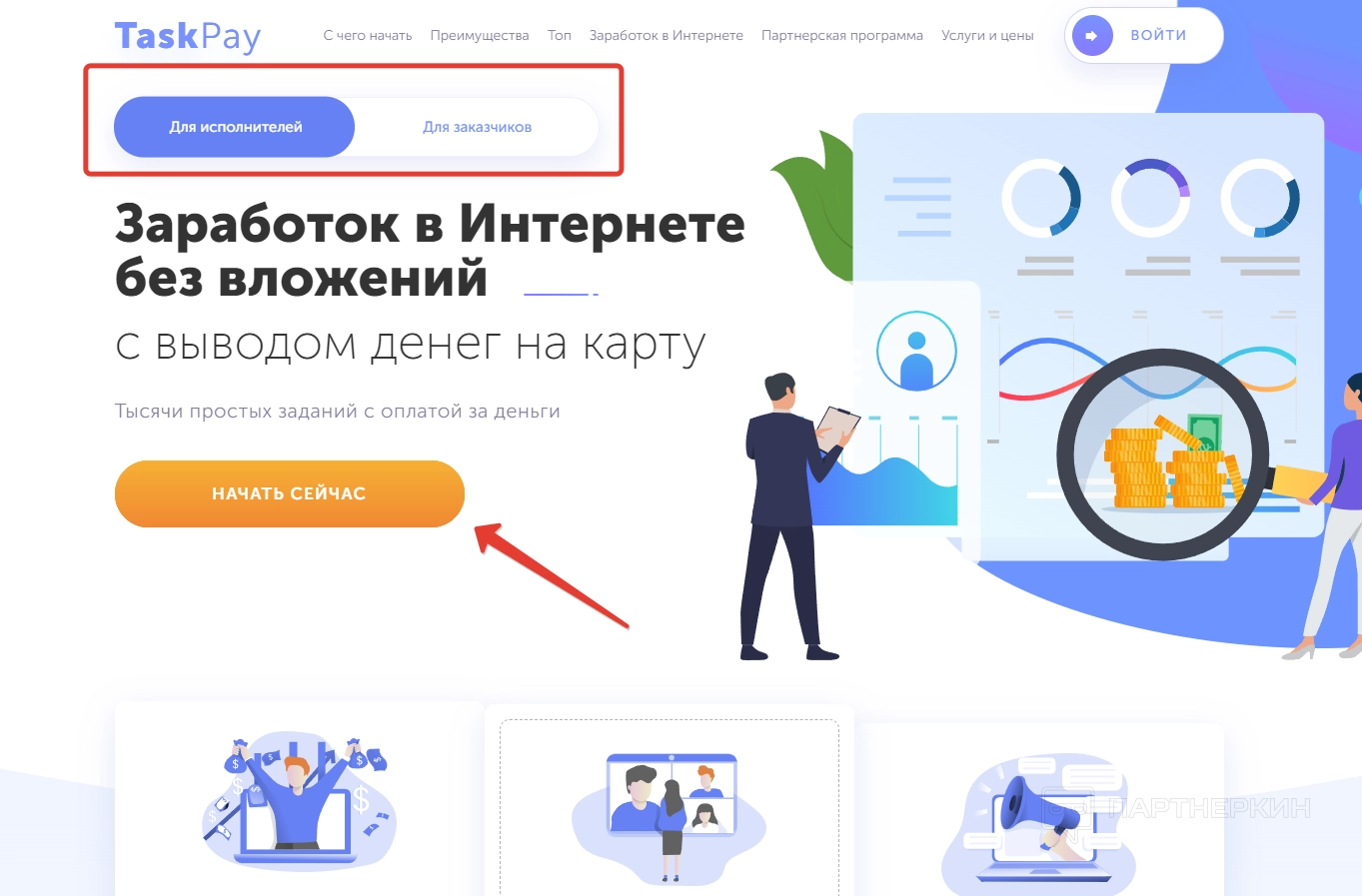 В первую очередь нужно зарегистрировать учетную запись. Только тогда появится возможность размещать или выполнять задания. Заходим на главную страницу сайта и жмем на кнопку «Начать сейчас», которая расположена в центральной части экрана. Выбирать тип аккаунта совсем необязательно, так как личный кабинет будет общим как для исполнителя, так и заказчика.