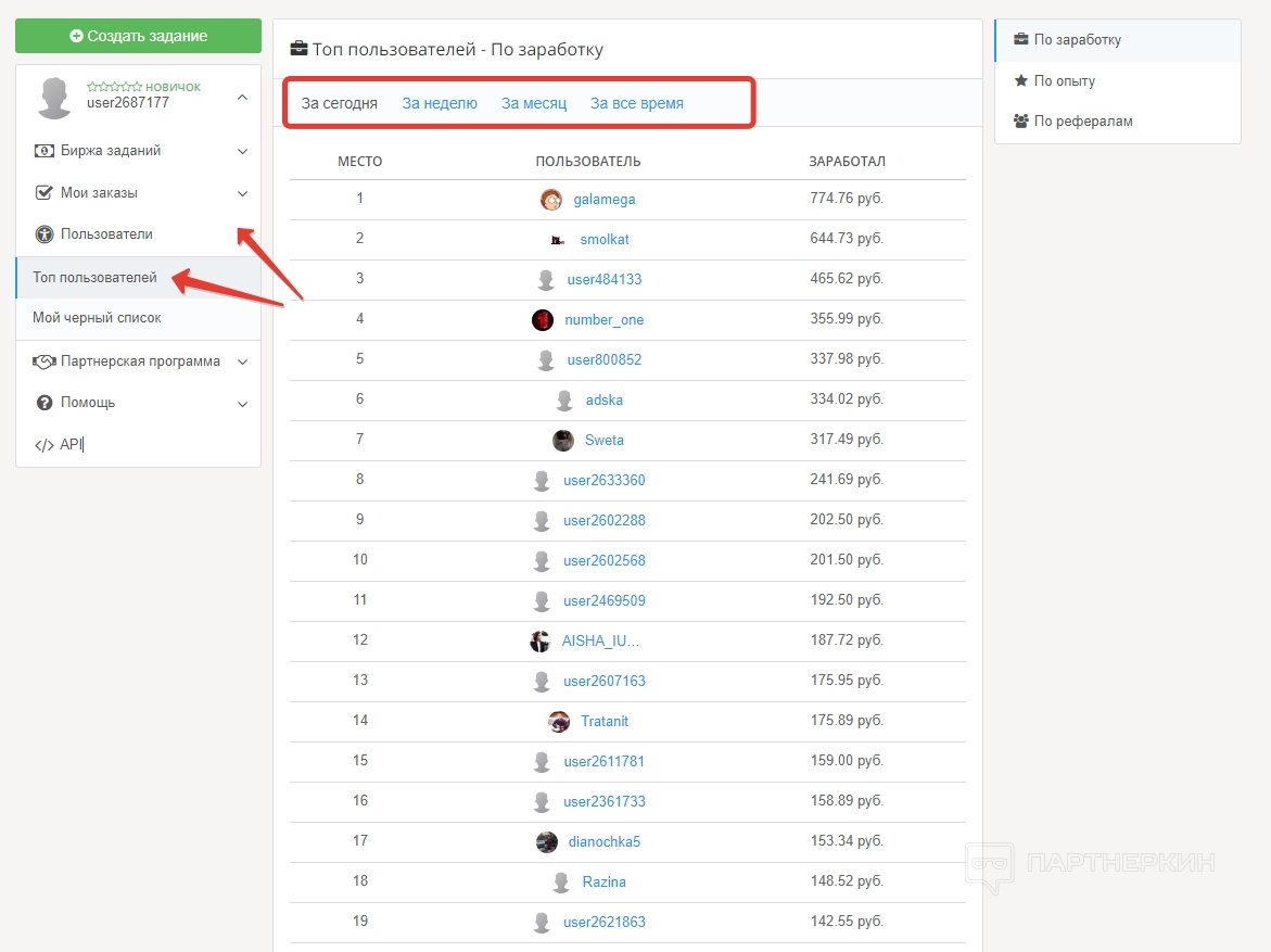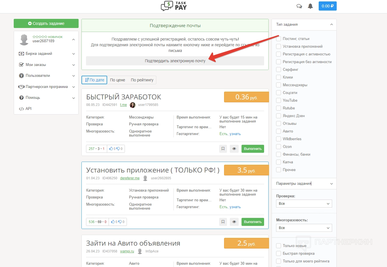 - новые задания — здесь пользователь может найти и взять новое задание;