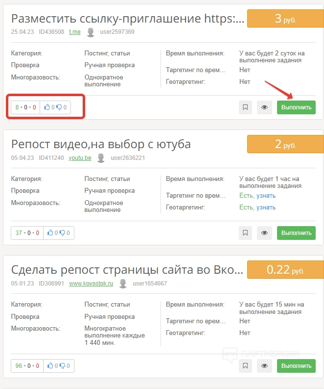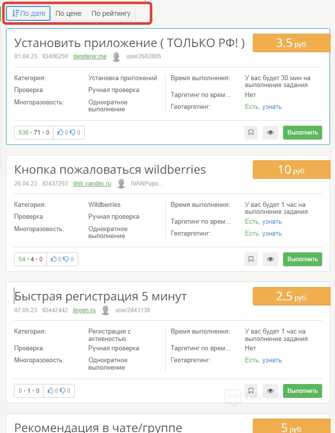 В соответствии с настроенными параметрами система подберет список подходящих вариантов. Когда найдется нужное задание, кликаем на кнопку «Выполнить». Не забываем обращать внимание на количество выполнений, а также отзывы и рейтинг задания. Все эти сведения находятся в нижнем левом углу карточки задания.