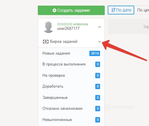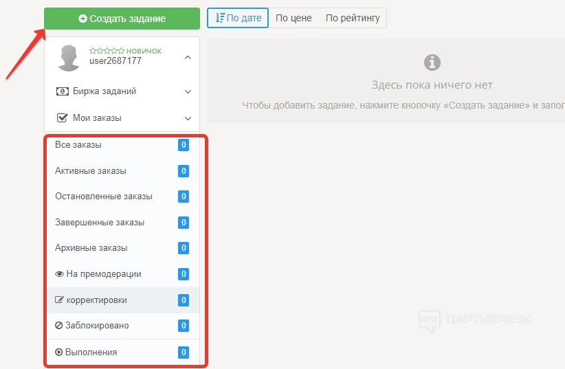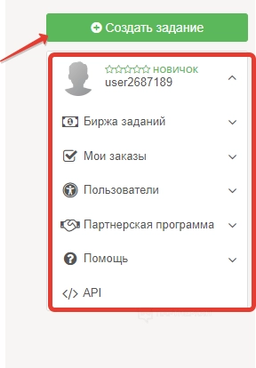 Чтобы оформить первое задание, поднимаемся в верхнюю часть панели управления и жмем на кнопку «Создать задание».