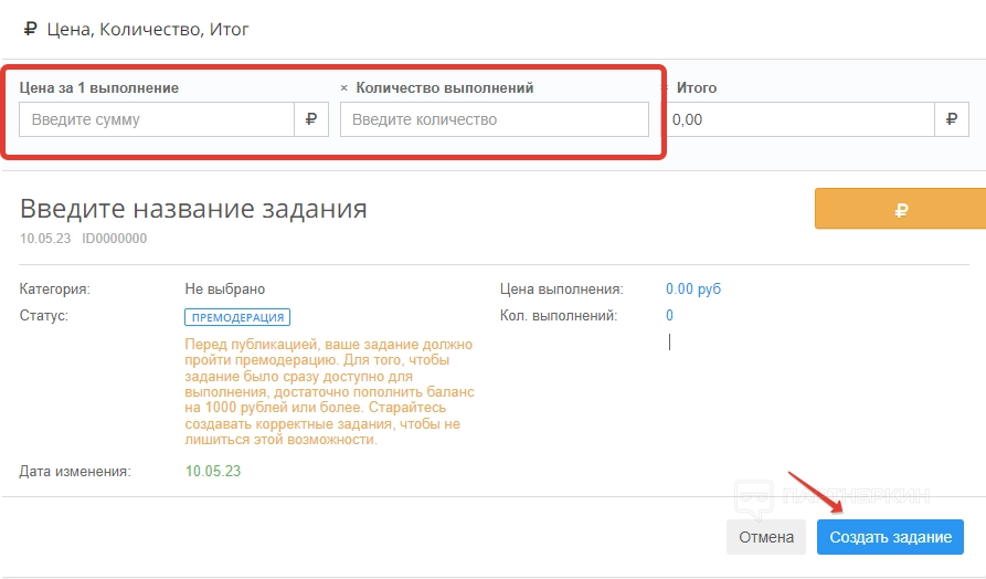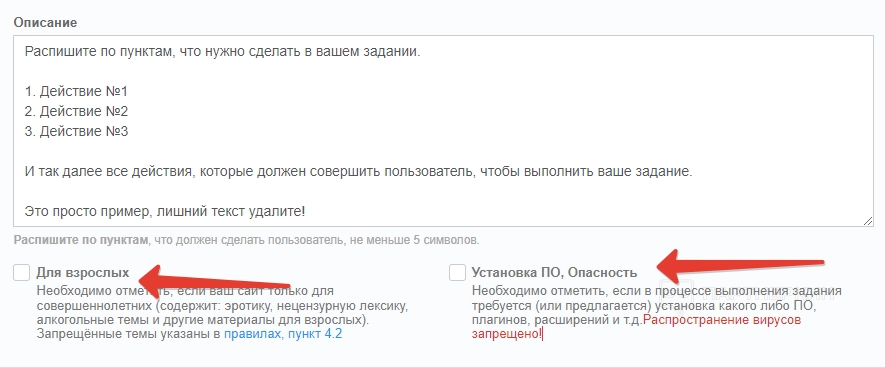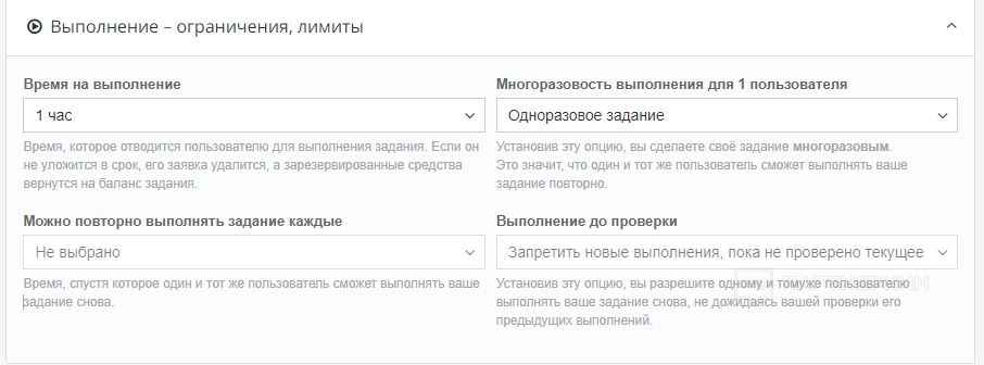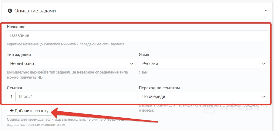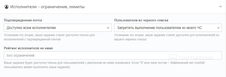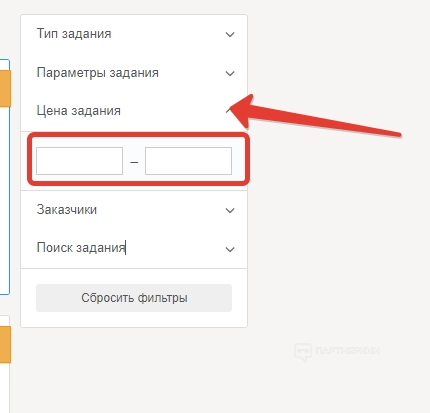 В разделе «Цена задания» вебмастер может прописать порог стоимости выполнения от и до. Для этого предусмотрены специальные строки.