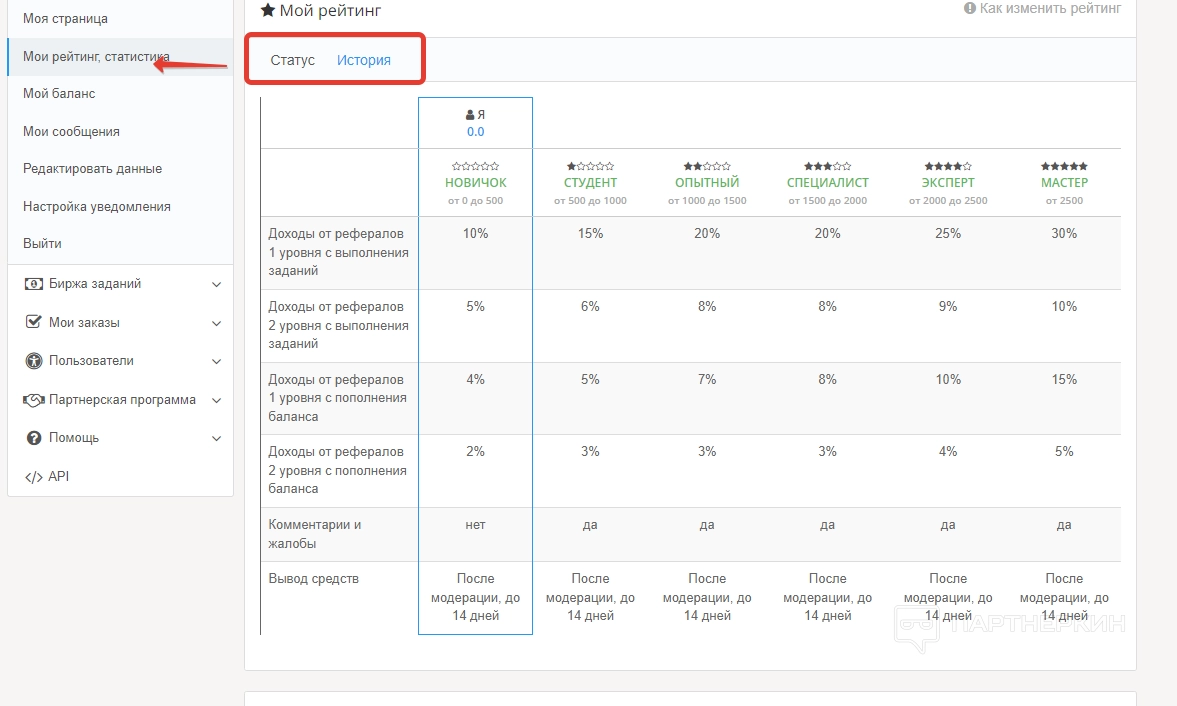 Во вкладке «Мой рейтинг, статистика» владелец учетной записи может ознакомиться со всеми статусами и историей своей активности. Для этого в верхней части дашборда есть соответствующие блоки.