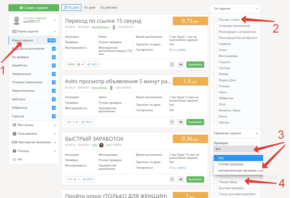 Если пользователь хочет упростить поиск, можно настроить поиск задания. Во-первых, выбираем в правой части экрана подходящий тип заданий. Например, «Постинг, статьи». Во-вторых, указываем автоматическую проверку и ставим галочку напротив «Только новые».
