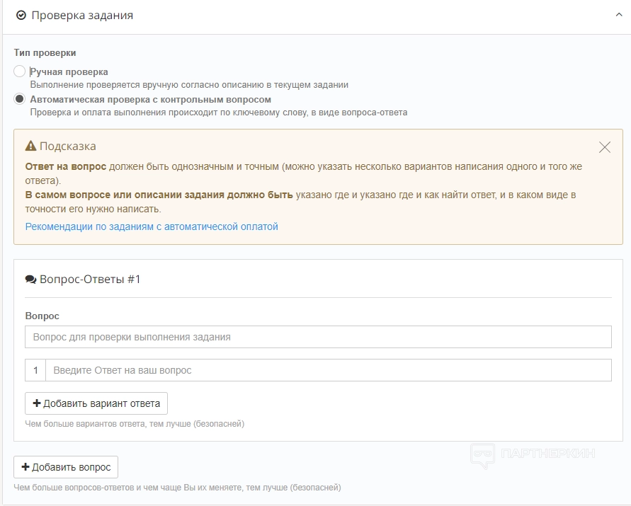 В разделе «Параметры задания» выбирает тип проверки (ручная или автоматическая), многоразовость задания (одноразовые или многоразовые) и виды заданий: