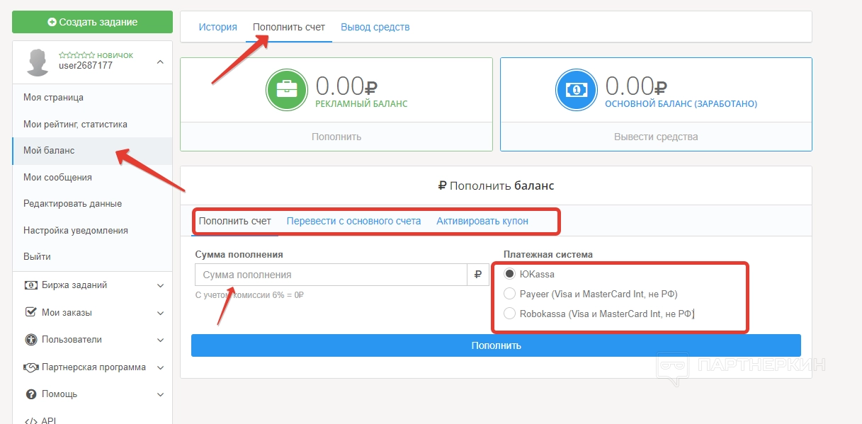 Во вкладке «Мой баланс» можно пополнять счет и выводить заработанные средства. Здесь же хранятся и отображаются финансы.