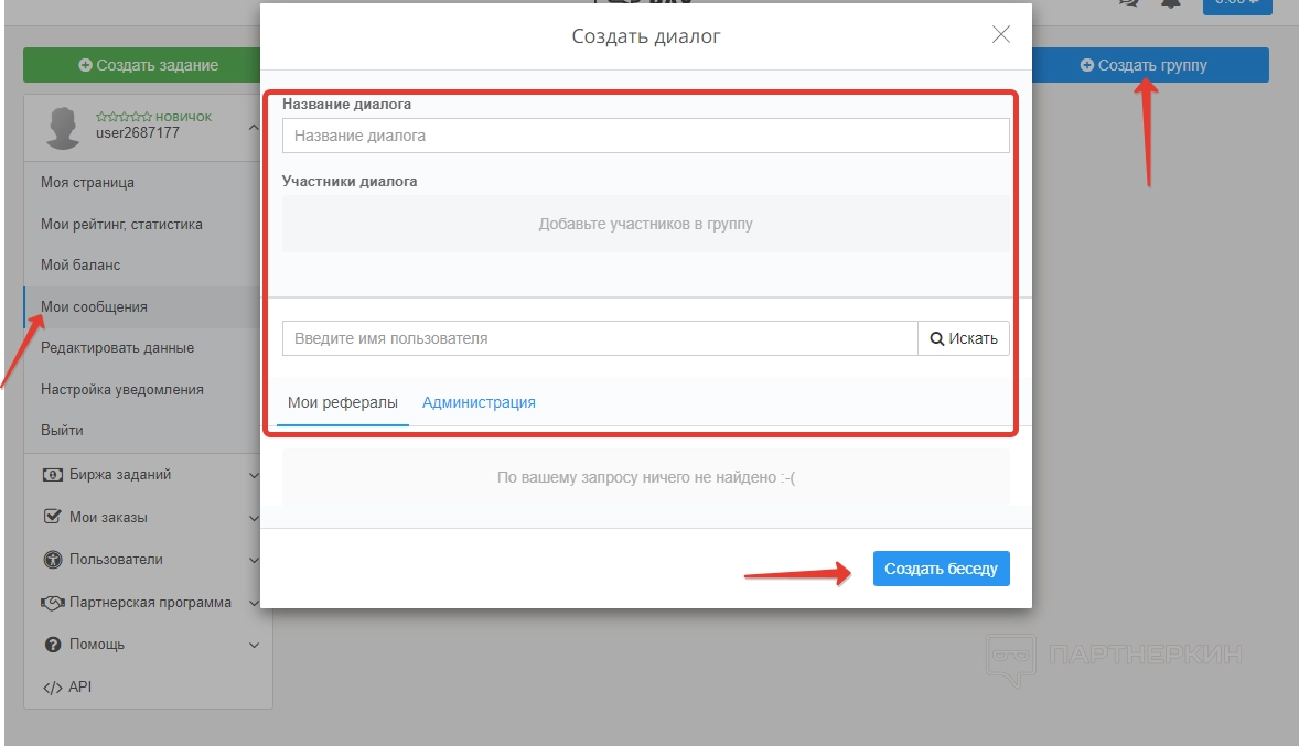 Далее идет вкладка «Мои сообщения», где можно создавать переписки с другими пользователями биржи. Чтобы начать переписку, жмем на кнопку «Создать группу» и заполняем форму: