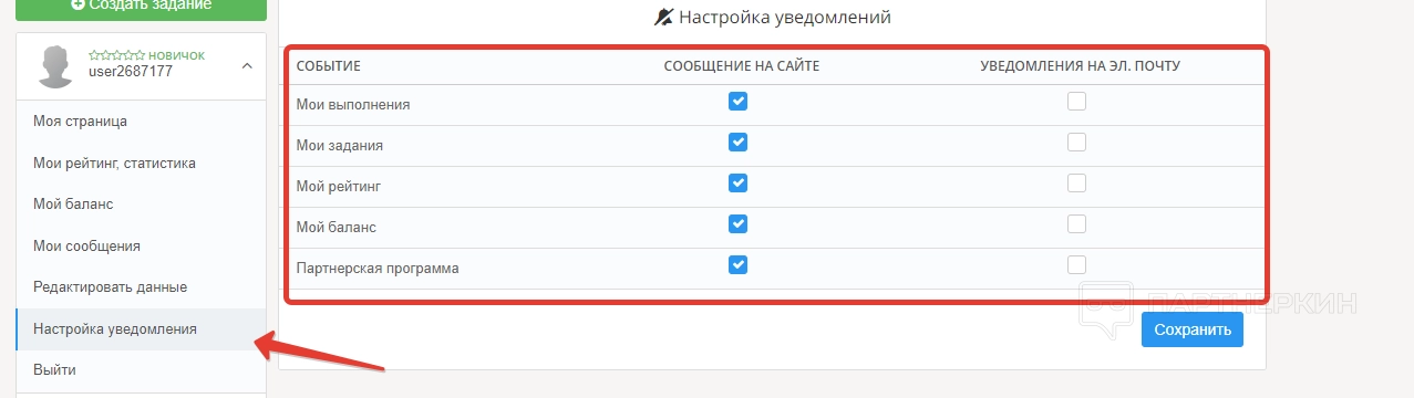 Вкладка «Настройка уведомлений» позволит отрегулировать способы отправки сообщений по разным событиям прямо на сайт или на указанную при регистрации почту.