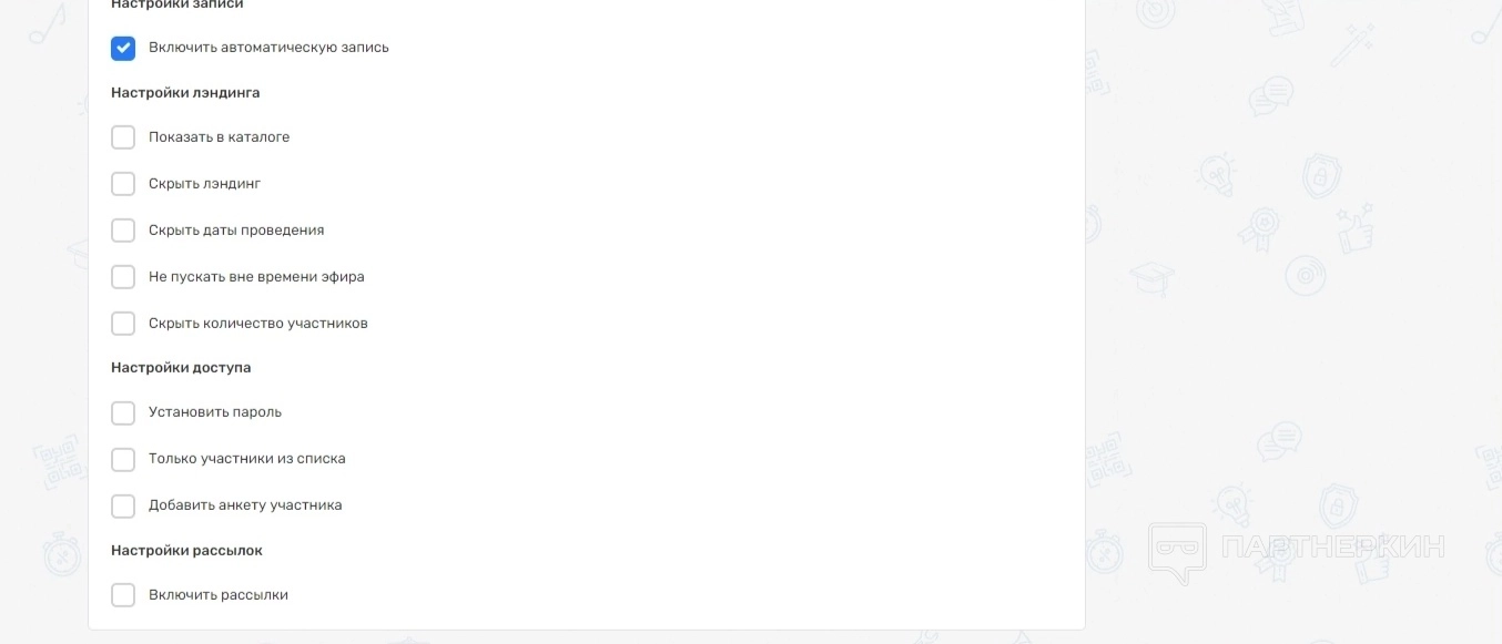 Затем устанавливаются нужные флажки. Среди них есть включение записи вебинара, базовые настройки лендинга, доступа в комнату и даже рассылок.