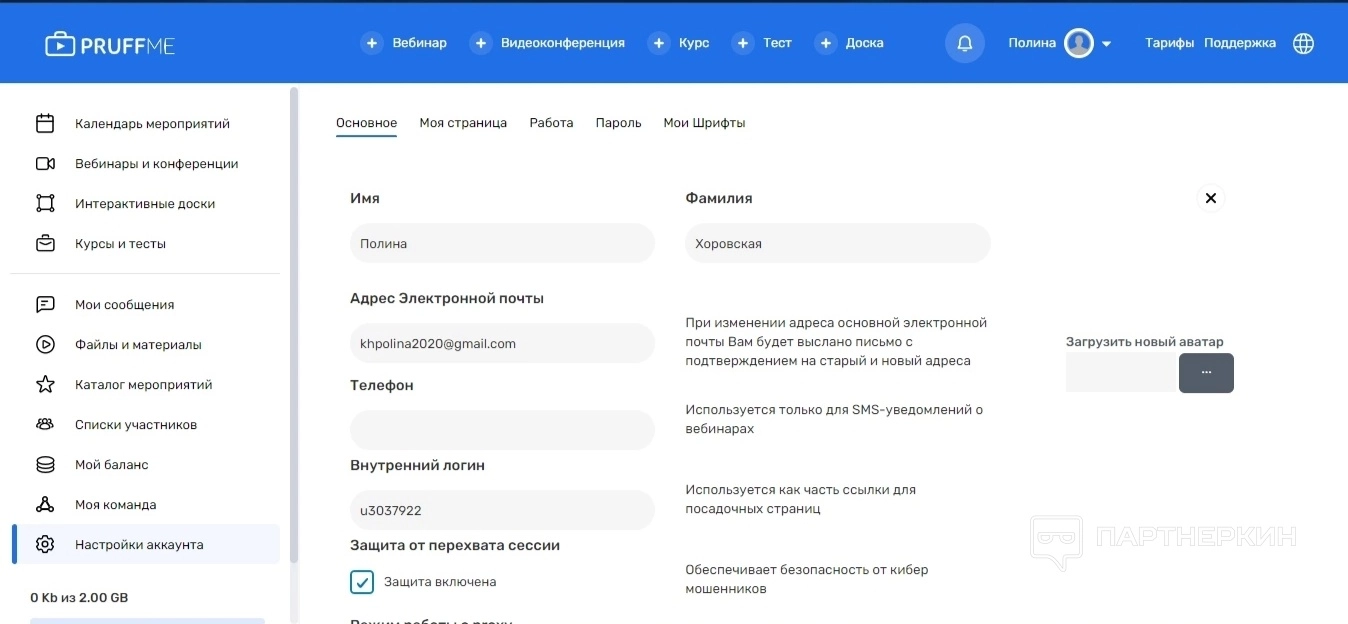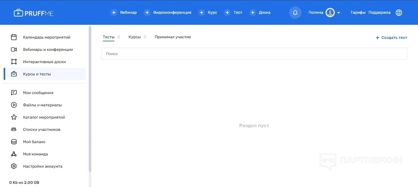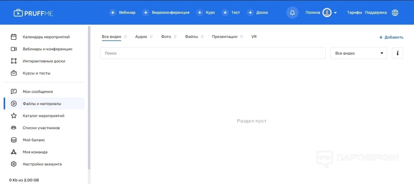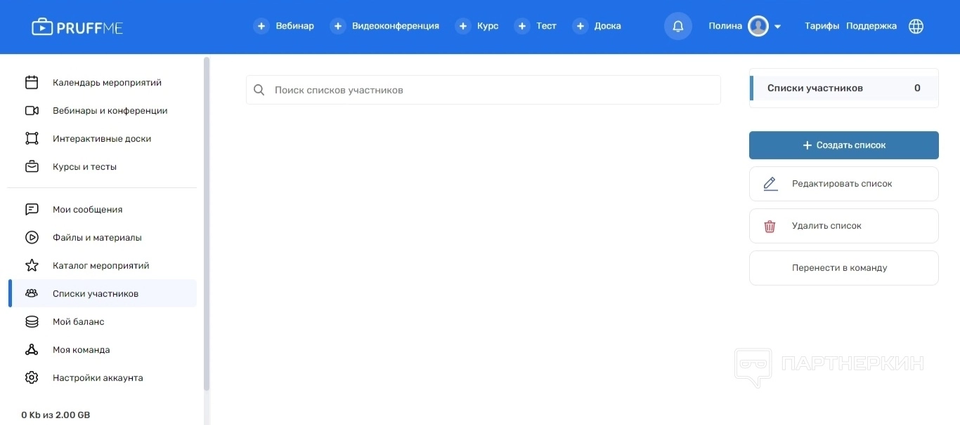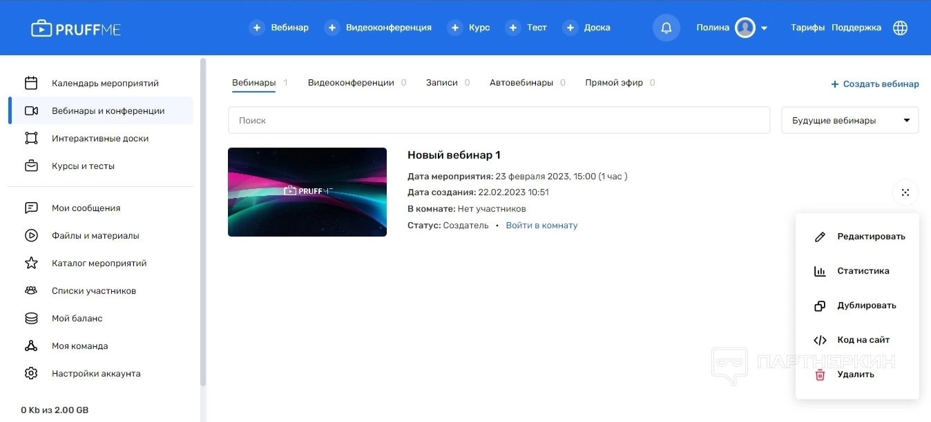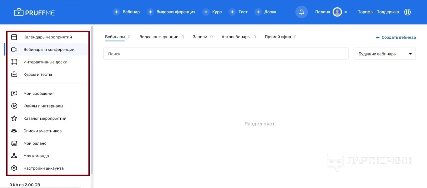 Первым разделом в списке являются Вебинары и конференции . Здесь будет находиться список когда-то созданных и уже прошедших или запланированных проектов. Отсюда можно создавать новые проекты.