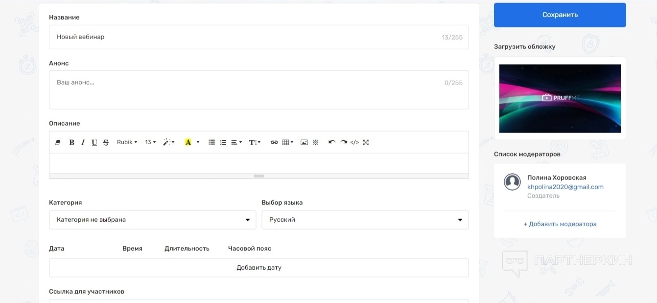 Пользователю необходимо указать все данные в специальных строчках, а именно: название, анонс, указать описание вебинара, назначить дату, язык и категорию. Можно добавить дополнительных модераторов, если позволяет тариф. Здесь же находится ссылка-приглашение, которой в дальнейшем можно поделиться со своими коллегами, друзьями, учениками и другими пользователями.
