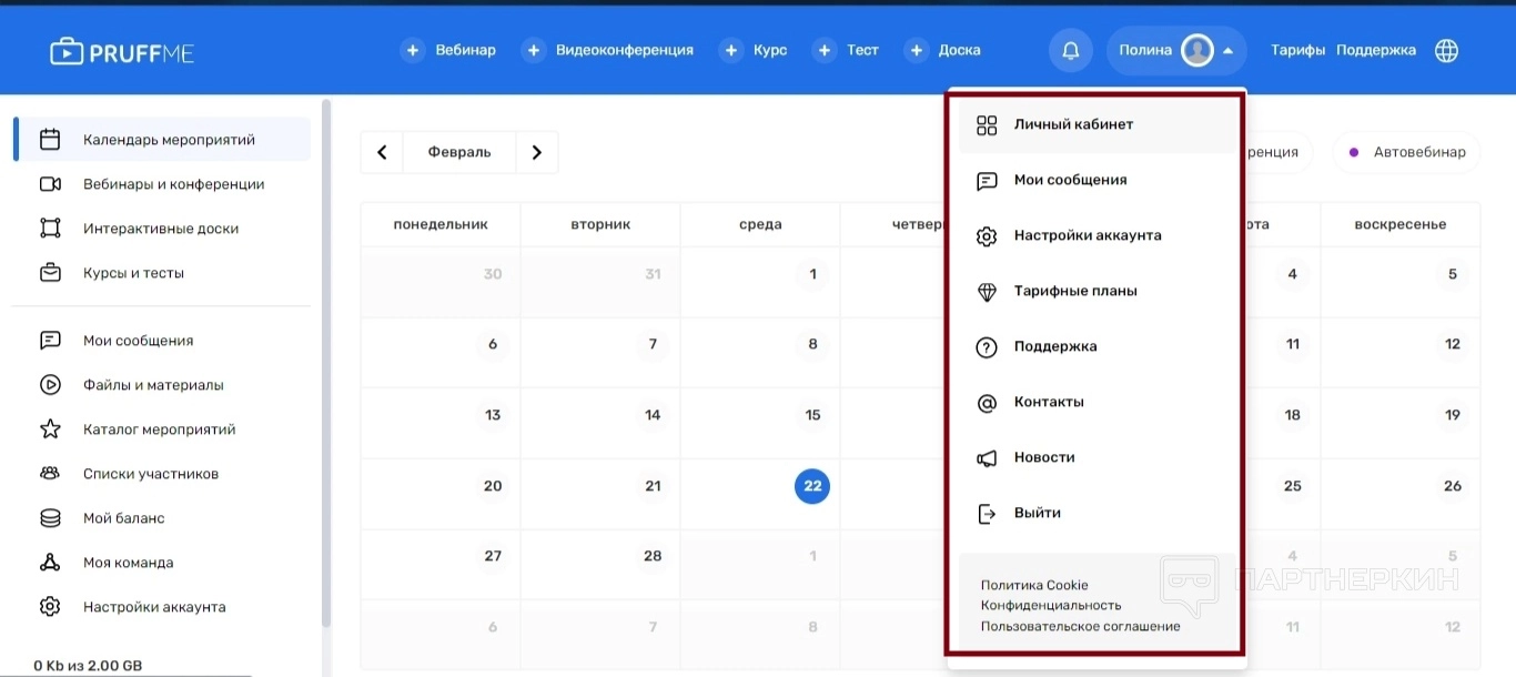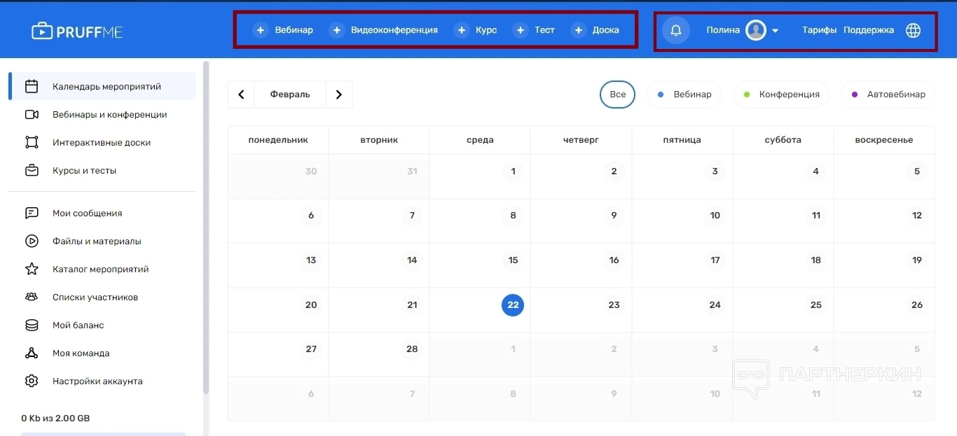 Готово, пользователь зарегистрирован и попадает на главную страницу личного кабинета, которой является календарь мероприятий — в нем будут отображаться все созданные в дальнейшем продукты (вебинары, конференции и так далее).