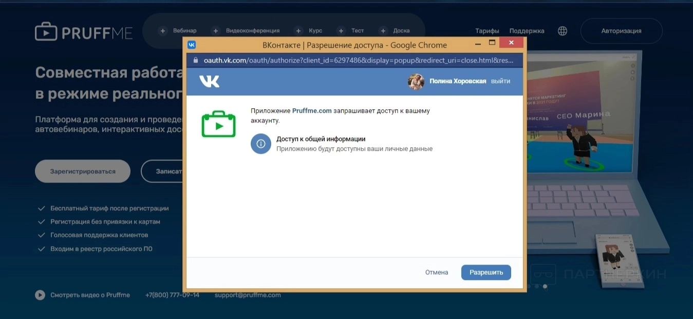 При выборе первого варианта открывается дополнительное окно, в котором нужно предоставить доступ платформе к аккаунту в социальной сети. Если пользователь выбирает регистрацию через номер телефона, то необходимо будет его ввести, после чего на него придет специальный код доступа.