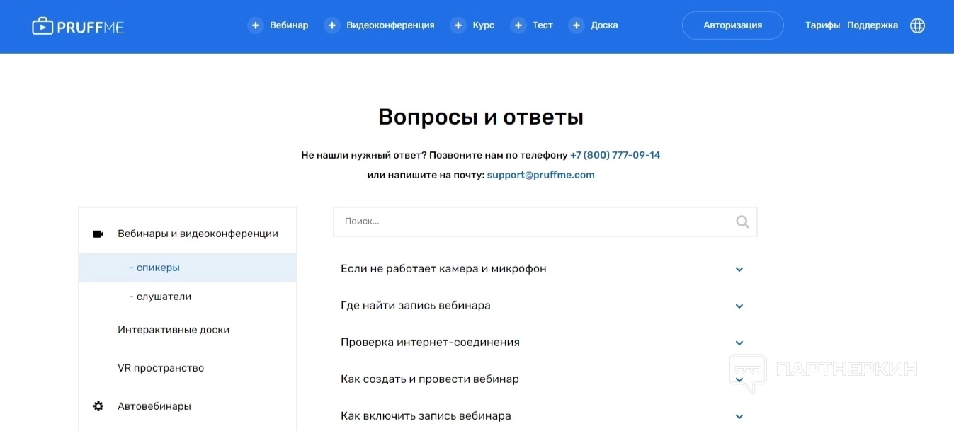 В разделе Техподдержка будущие клиенты могут ознакомиться со всеми интересующими их вопросами касательно работы с сервисом и его предоставляемыми инструментами. Помимо этого, здесь есть необходимые контактные данные для связи с разработчиками, а именно номер телефона поддержки и рабочая почта.