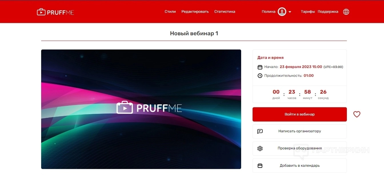 Далее попадаем в дополнительное окно, в котором видим будущий вебинар. Здесь уже видны дата проведения, отсчет до начала, а также дополнительные кнопки для связи с организатором, добавления в личный календарь и другие.