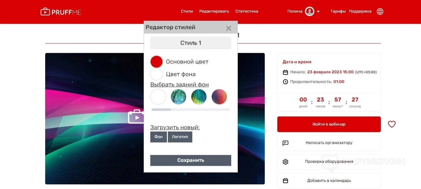 Благодаря кнопке Стиль организатор может редактировать внешний вид заднего и переднего фонов.