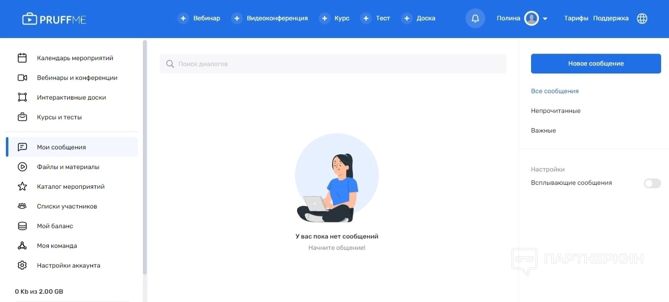 В сообщениях будут отображаться все будущие диалоги пользователя.