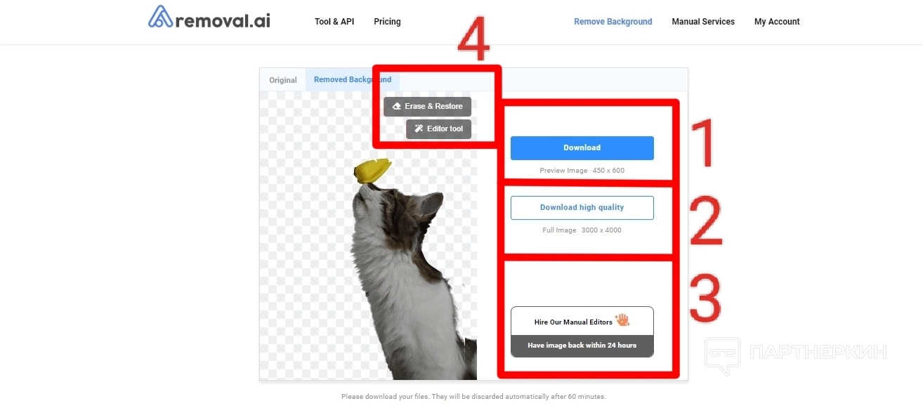 1. Если пользователя все устраивает, то изображение можно скачивать, исходя из своей подписки. Загрузка доступна в формате превью/предварительном просмотре (1) или высоком качестве (2), если есть кредиты. Если качество обработки изображения не устраивает, то можно заказать услуги специалиста (3) или отредактировать его вручную самостоятельно (4).