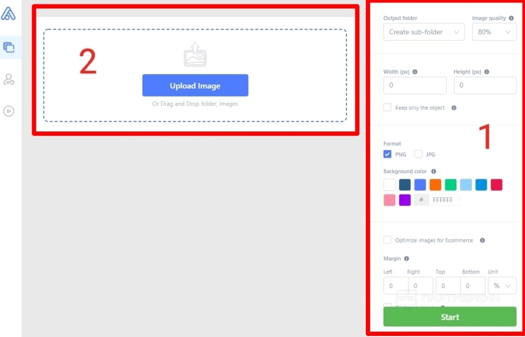 . В правом вертикальном столбце (1) находятся основные инструменты для работы с изображением. Здесь можно поменять фон на любой понравившийся цвет, изменить размеры фото и так далее. Делать это необходимо до того, как начнется загрузка изображения, иначе программа просто удалит фон и оставит его прозрачным.