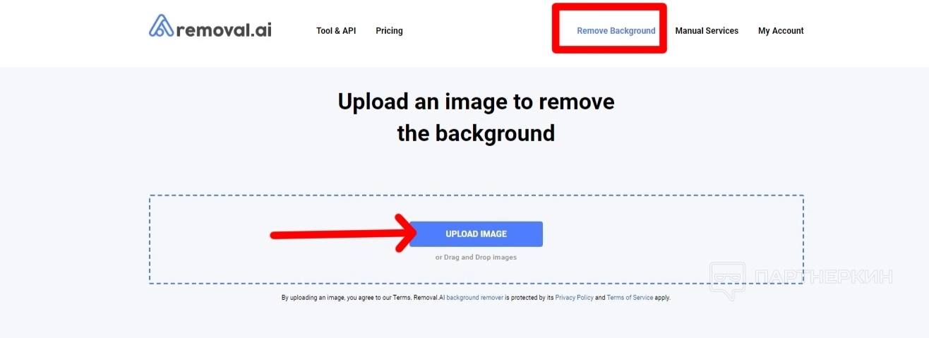 1. На главной странице сайта нажимаем на Remove Background , а затем на Upload Image .
