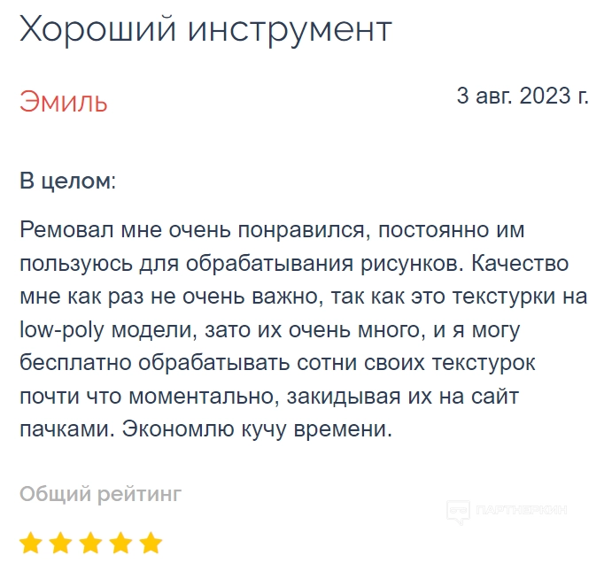 Пользователь Эмиль отмечает, что пользуется сервисом уже достаточно давно и ему важна моментальная обработка множества изображений: