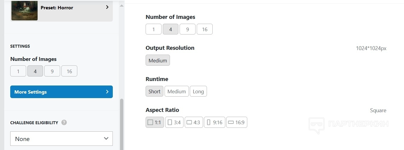 Можно выбрать количество изображений — от 1 до 16, и другие дополнительные настройки, например, размер, формат — квадратный, вертикальный.