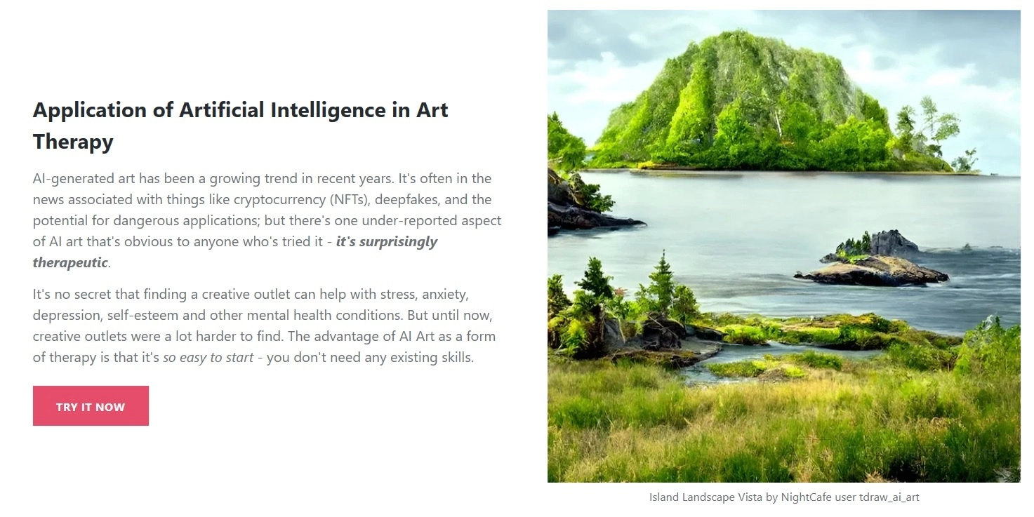 Генератор искусств с искусственным интеллектом для творческого самовыражения может помочь расслабиться, снять стресс и очистить разум. Поиск творческой отдушины поможет справиться со стрессом, тревогой, депрессией и другими психическими расстройствами. Преимущество AI Art как формы терапии заключается в том, что начать очень просто — не нужны какие-либо существующие навыки.