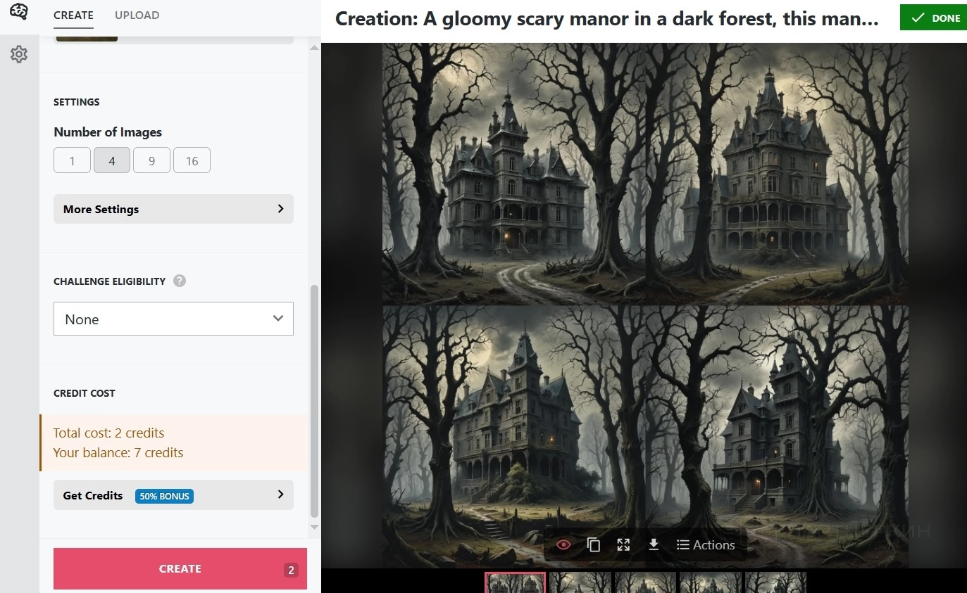 У сервиса есть бесплатная версия. Она представлена как неограниченное количество базовых поколений Stable Diffusion. Базовое поколение — это большое разрешение, короткое время работы и одно изображение. Более мощные настройки (например, более высокое разрешение или фотореалистичная диффузия) стоят кредитов, но можно получить бесплатное пополнение в виде 5 кредитов каждый день. Также можно заработать больше кредитов, участвуя в сообществе и челленджах.
