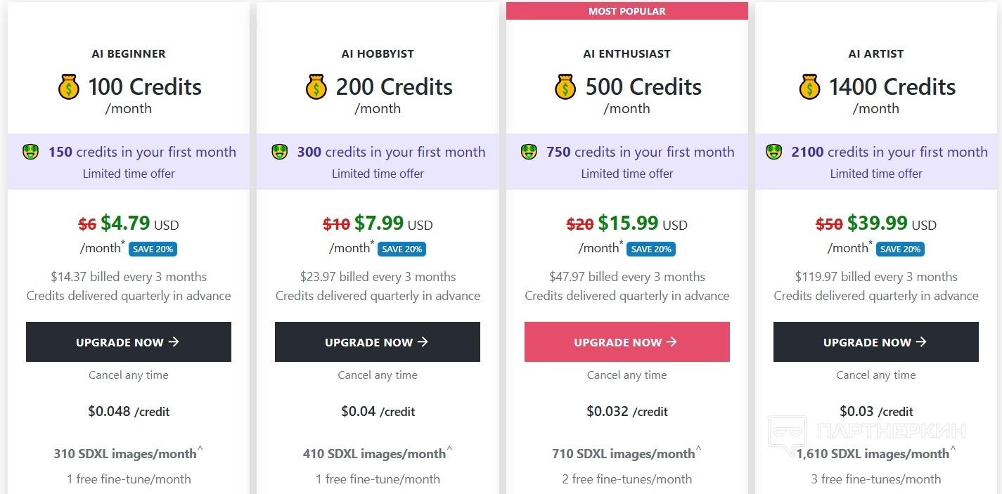Платные тарифы позволяют покупать больше кредитов, если нужно большое количество сгенерированных изображений. Они начинаются от $4,79 / мес. Кроме того, платные тарифы дают такие преференции, как: