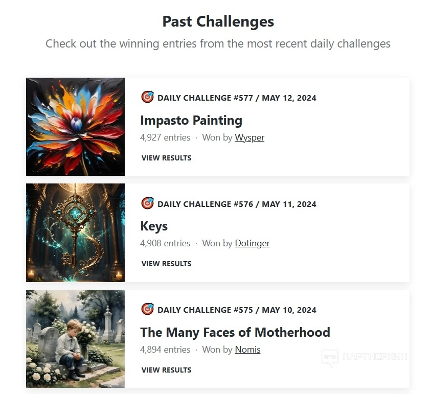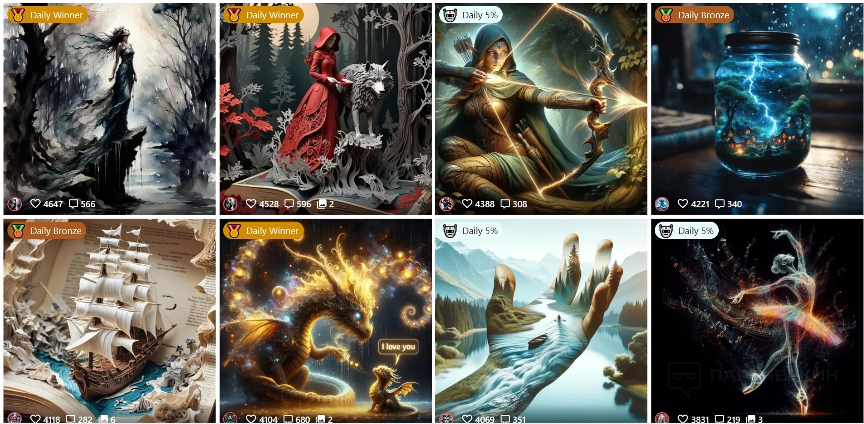 Такие конкурсы и челленджи помогают проверить и прокачать творческие способности и навыки написания промтов. Каждый день тысячи людей голосуют за друг друга и выбирают лучшие работы. Участвуя в активностях, пользователь может получать дополнительные кредиты на бесплатную генерацию изображений.
