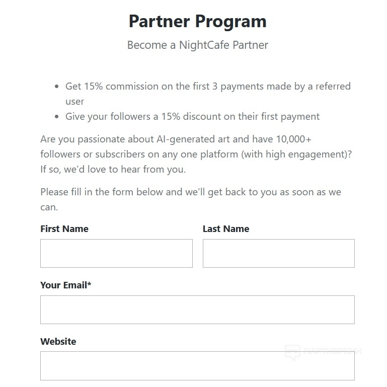 Условие участия в партнерской программе — наличие собственной базы от 10 000+ подписчиков на любой платформе, например в любой соцсети. Для присоединения к партнерке нужно заполнить заявку на соответствующей странице «Партнерская программа».