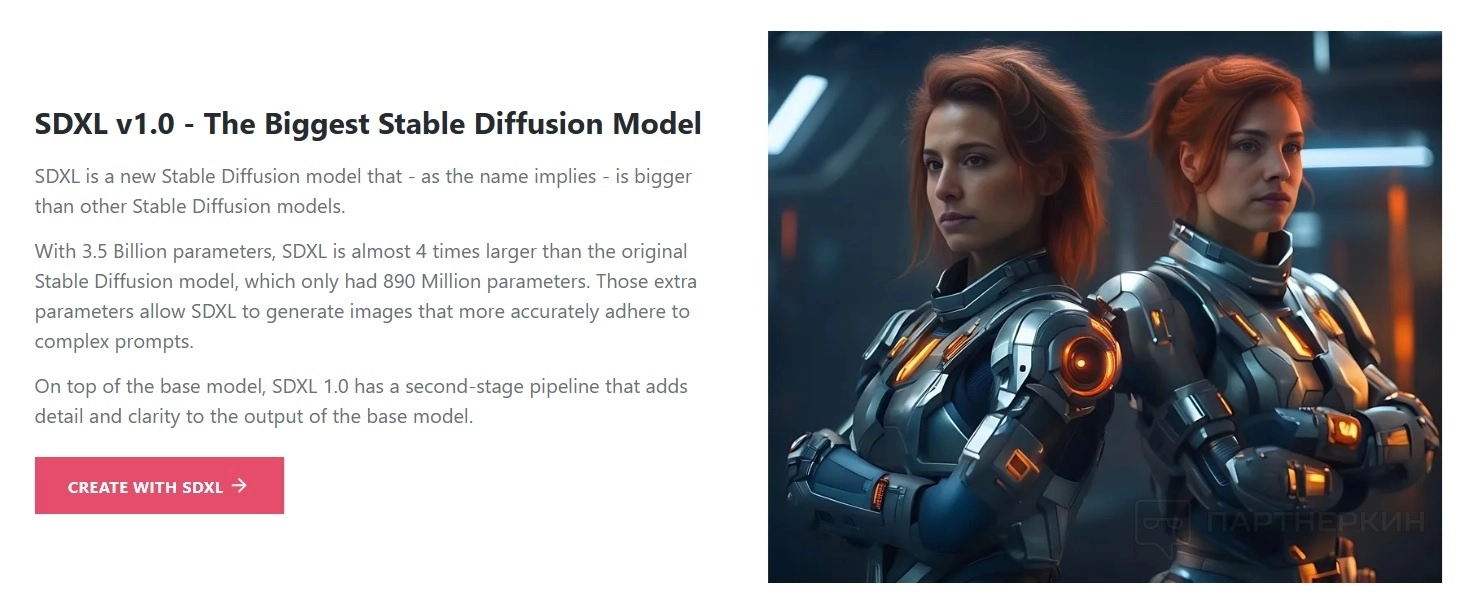SDXL — это новая модель стабильной диффузии, которая больше по размеру и функциональна по сравнению с предыдущими моделями. Имея 3,5 миллиарда параметров, SDXL почти в 4 раза больше, чем оригинальная модель стабильной диффузии, которая имела только 890 миллионов параметров. Эти дополнительные параметры позволяют SDXL генерировать изображения, которые более точно соответствуют сложным запросам. Помимо базовой модели, SDXL 1.0 имеет конвейер второго уровня, который добавляет детализацию и ясность в выходные данные базовой модели.