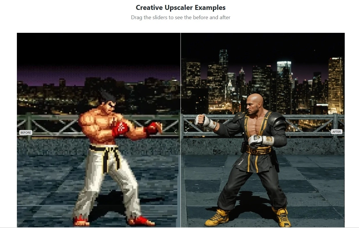 Эта функция позволяет улучшать изображения. Новый Creative Upscaler от Stability AI может масштабировать изображения до разрешения 4k и создавать новые детали, которых раньше не было. Чтобы использовать апскейлер, понадобится выбрать и загрузить изображение для улучшения, добавить текстовую подсказку, отрегулировать уровень креативности. Более высокая креативность позволяет ИИ «галлюцинировать» больше деталей, более низкая креативность будет ближе к исходному изображению. Опция позволяет полностью переосмыслить изображение низкого качества или 2D пиксельное изображение, например из старой компьютерной игры.