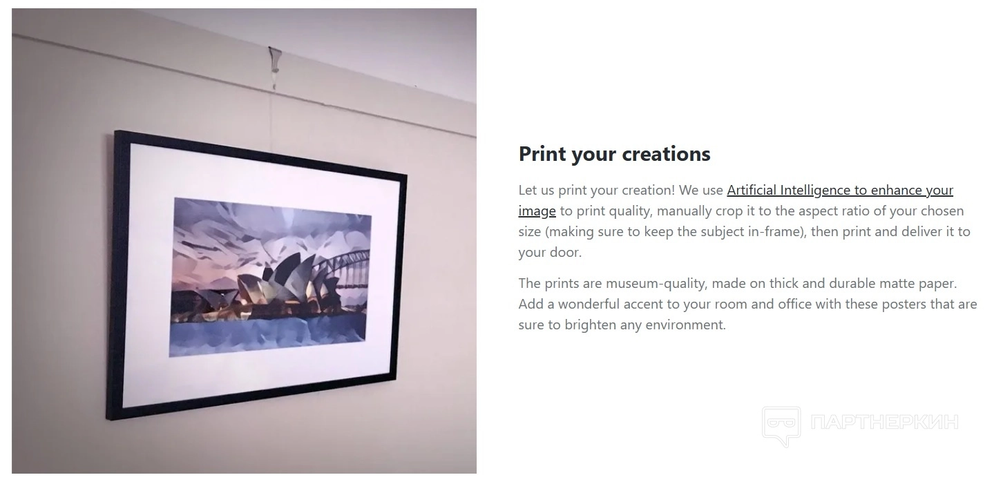 Оплата также идёт за заказ изображения для печати или за расширенное использование самого автора. Сервис использует искусственный интеллект для улучшения качества изображения до печати, вручную обрезает его до соотношения сторон выбранного размера (следя за тем, чтобы объект не выходил в кадр), а затем распечатывает и доставляет его до двери. Отпечатки музейного качества выполнены на плотной и прочной матовой бумаге.