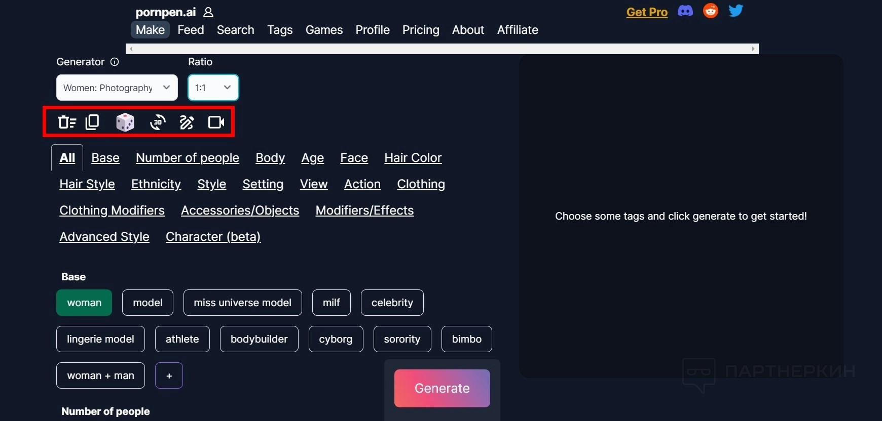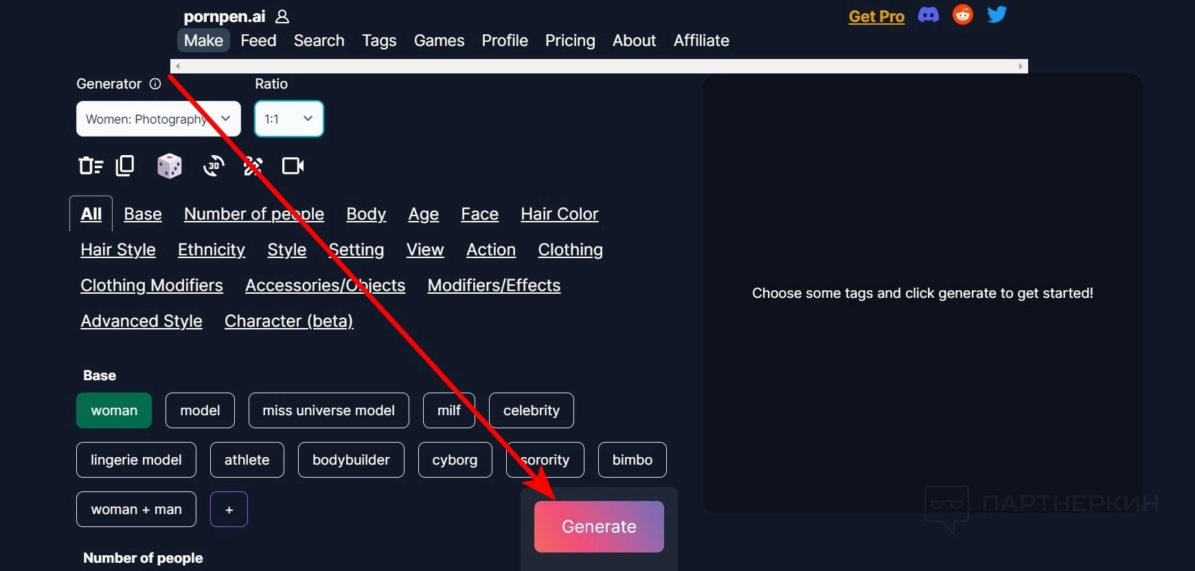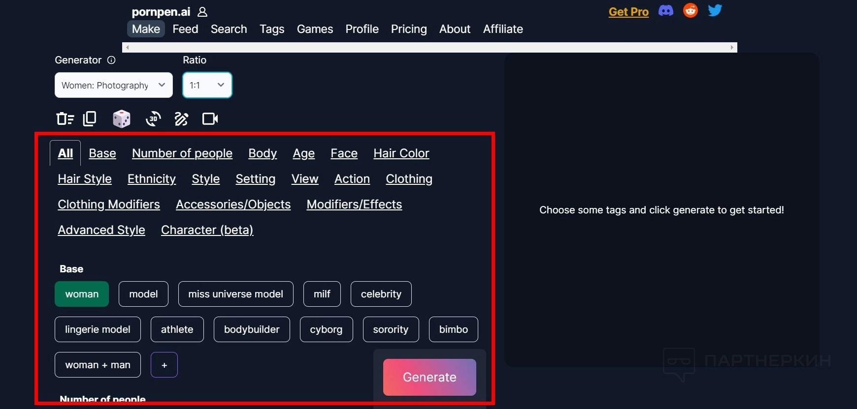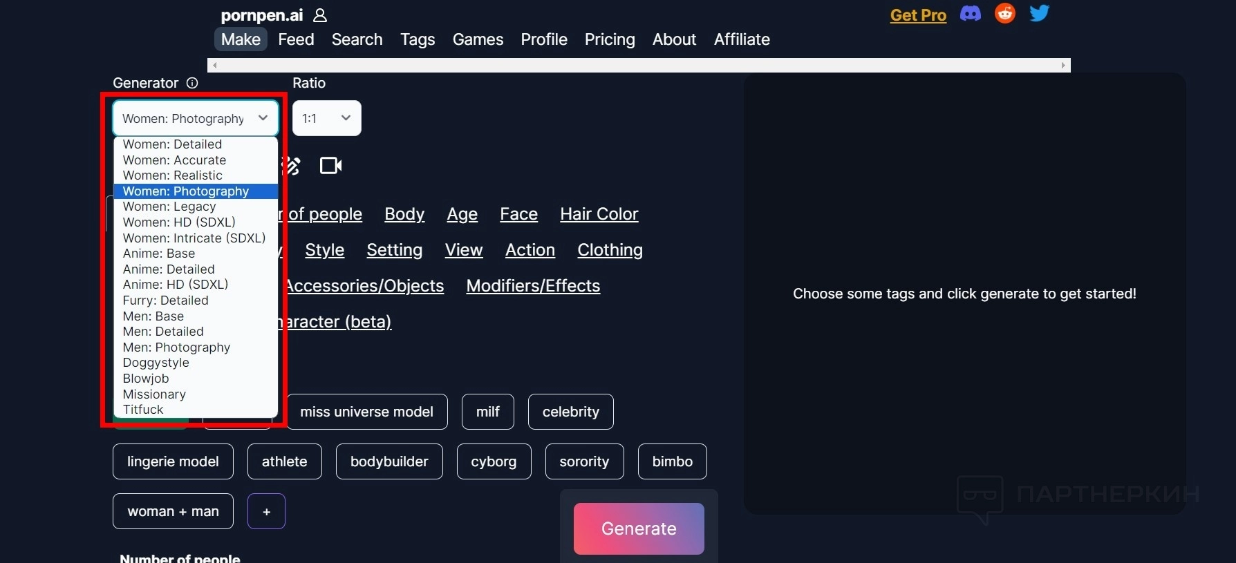 На первом этапе создания изображения пользователи могут выбирать из предустановленных кнопок, таких как «большая грудь», «нижнее белье», «модель», «блондинка» и другие, чтобы указать предпочтения во внешности. Кроме того, на сайте представлены готовые изображения, уже сгенерированные нейросетью, готовые к использованию.