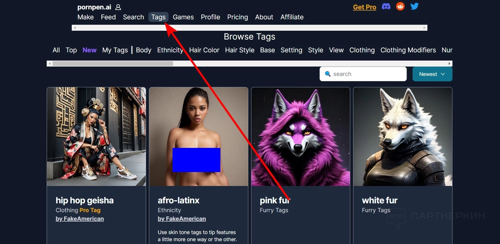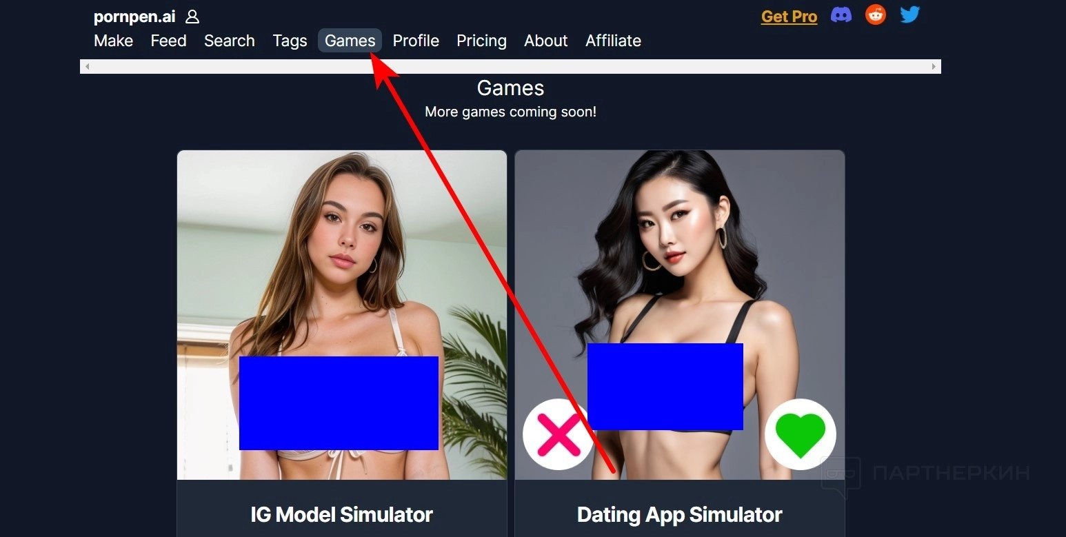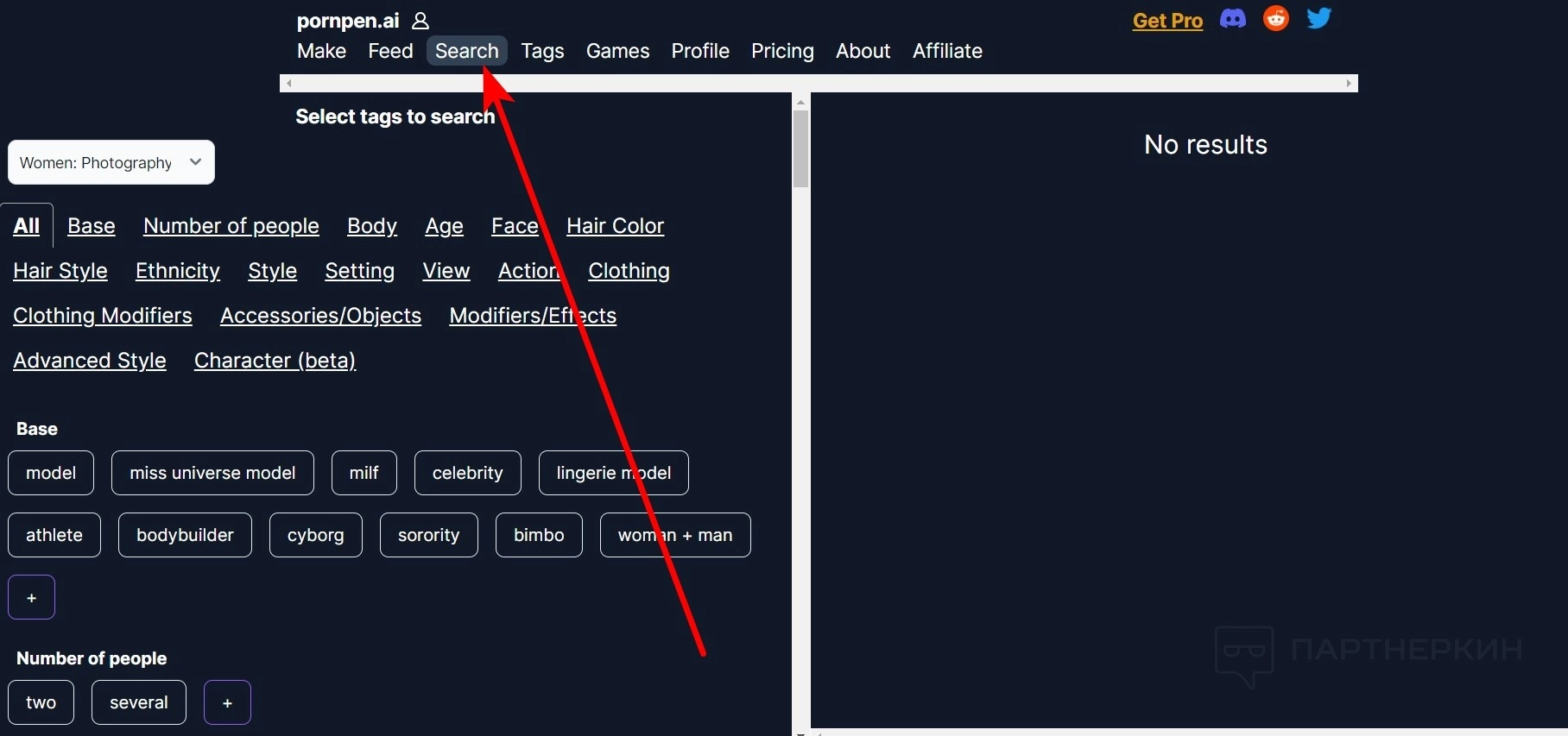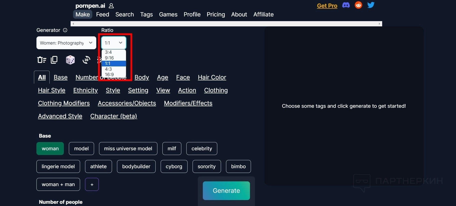 На первом этапе создания изображения пользователи могут выбирать из предустановленных кнопок, таких как «большая грудь», «нижнее белье», «модель», «блондинка» и другие, чтобы указать предпочтения во внешности. Кроме того, на сайте представлены готовые изображения, уже сгенерированные нейросетью, готовые к использованию.
