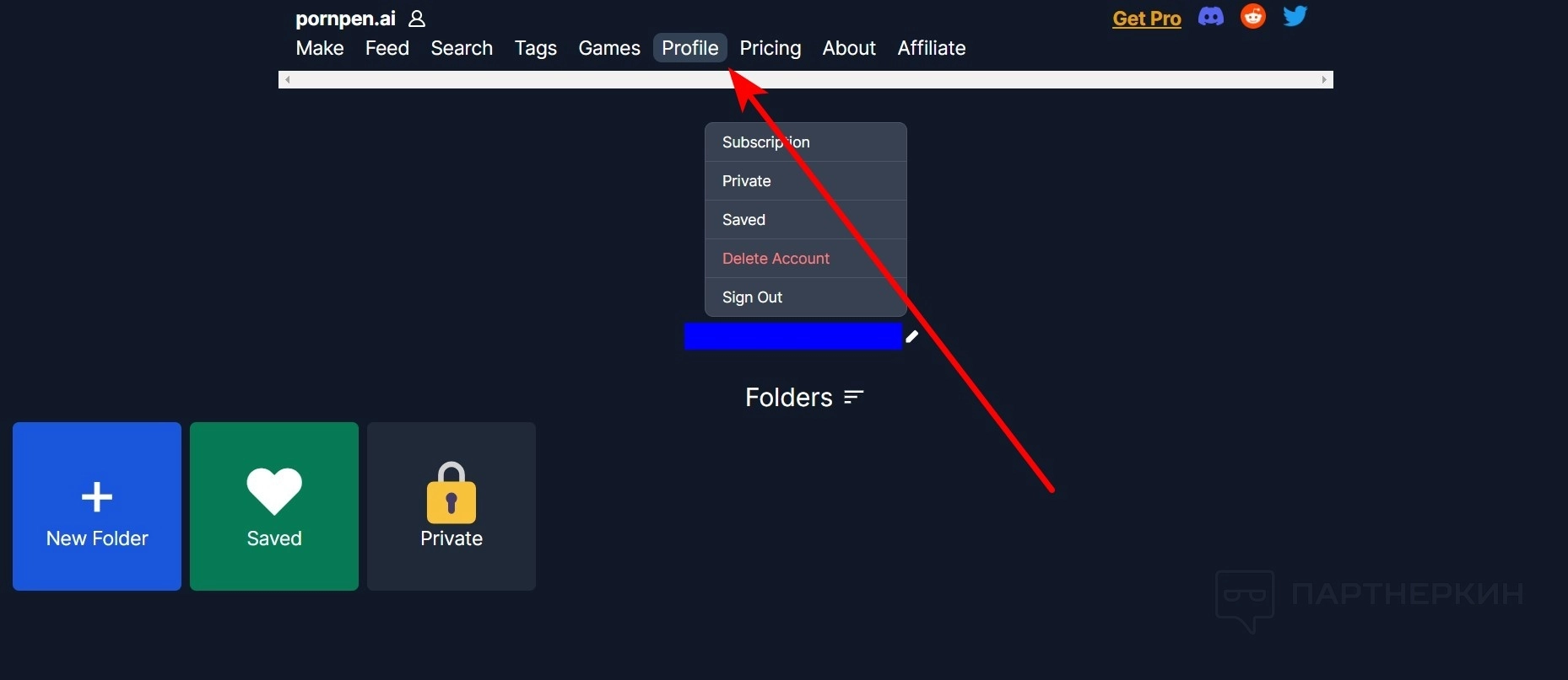 - Profile. Настройка аккаунта. Можно менять контактные данные (пароль), управлять подписками, создавать папки, куда сохранять сгенерированные картинки, открывать изображения из избранного;