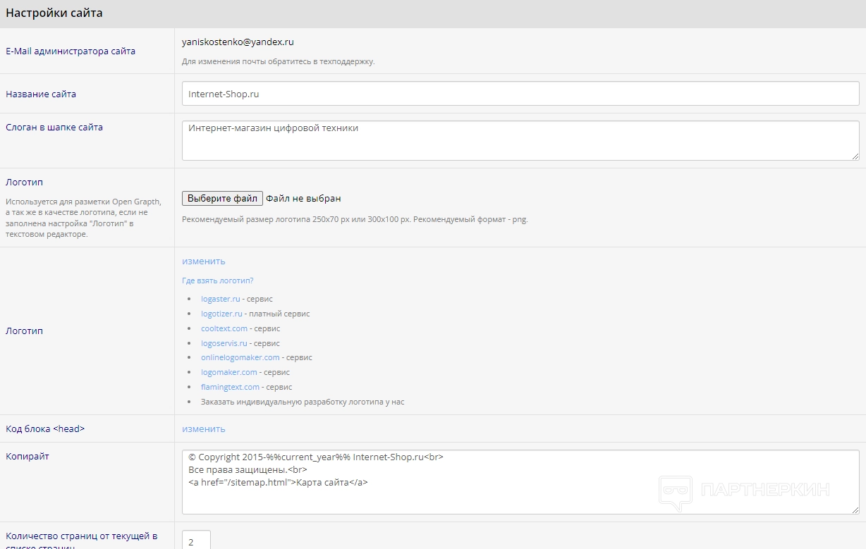 Данный раздел имеет несколько важных вкладок. Например, во вкладке «Настройки» можно вносить различные изменения в общие и дополнительные настройки интернет-магазина. Здесь владелец веб-ресурса может выдавать права, менять название магазина, слоган, логотип, различные шаблоны и контактную информацию.