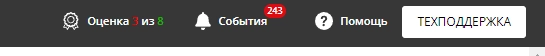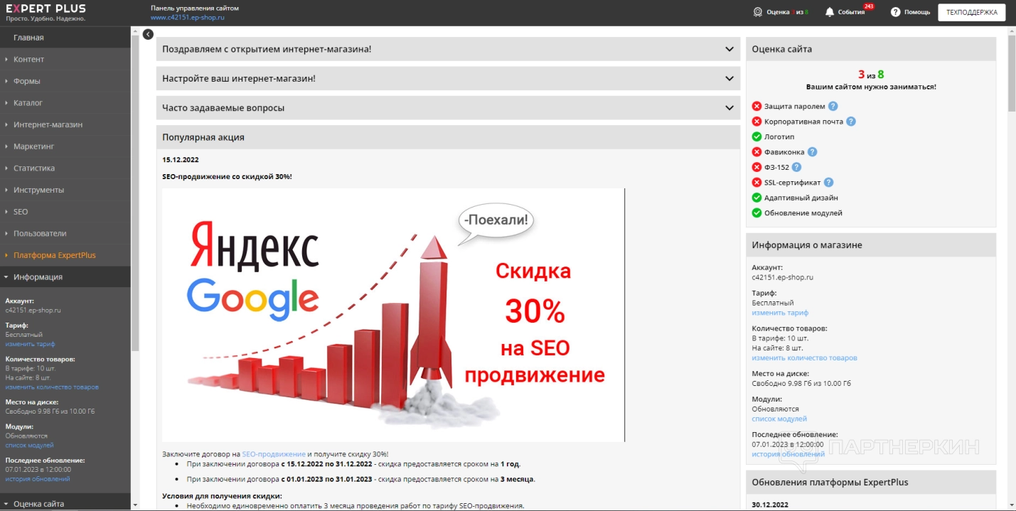 В верхней части экрана у нас находится панель уведомлений. Тут можно ознакомиться с общей оценкой созданного магазина, последними событиями и разделом для связи с техподдержкой.
