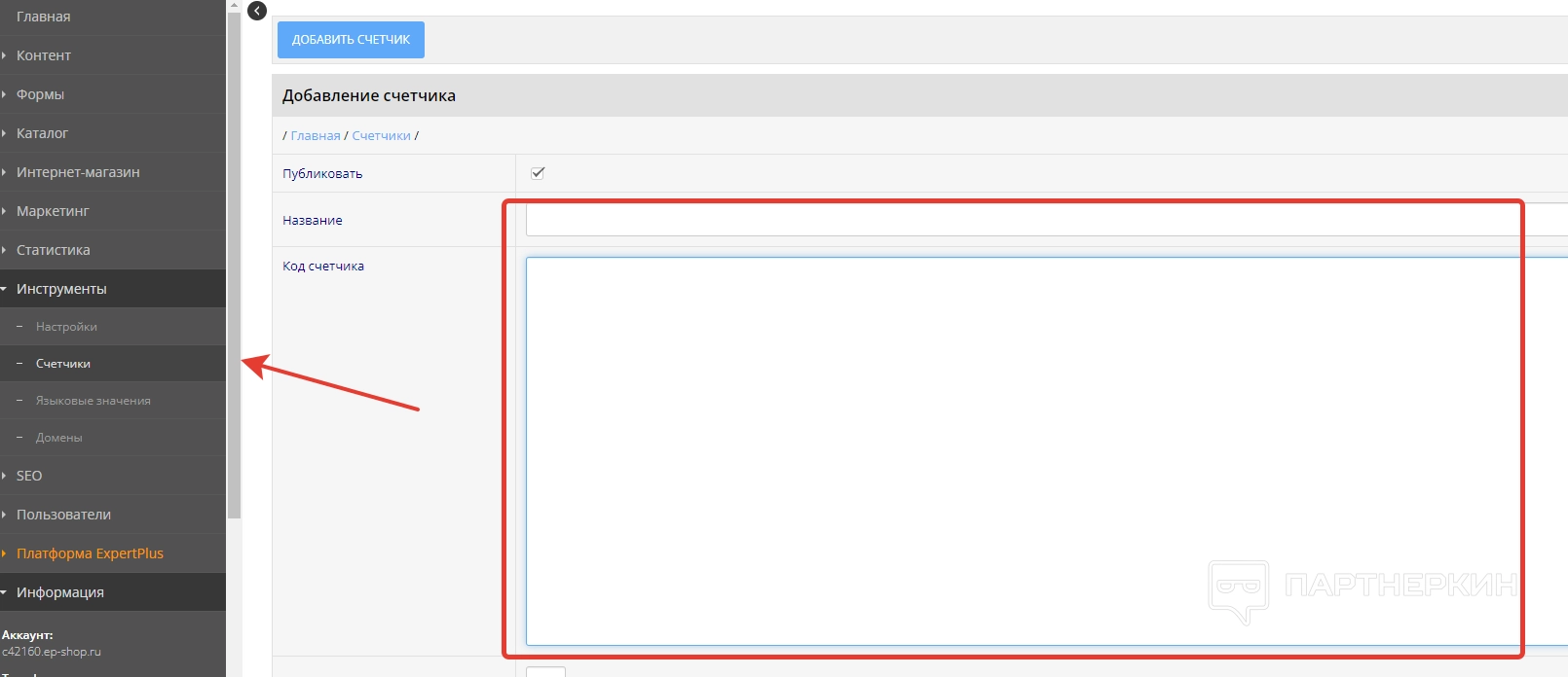 Далее идет вкладка «Счетчики», где можно подключать разные счетчики. Для этого используем соответствующую кнопку и заполняем форму, где нужно указать название и код счетчика.