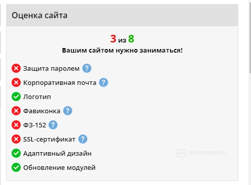 Под панелью уведомлений расположен блок, где прописаны параметры, на основе которых устанавливается оценка сайта. По умолчанию система будет показывать 3 из 8. Однако после настройки некоторых параметров оценка увеличится.